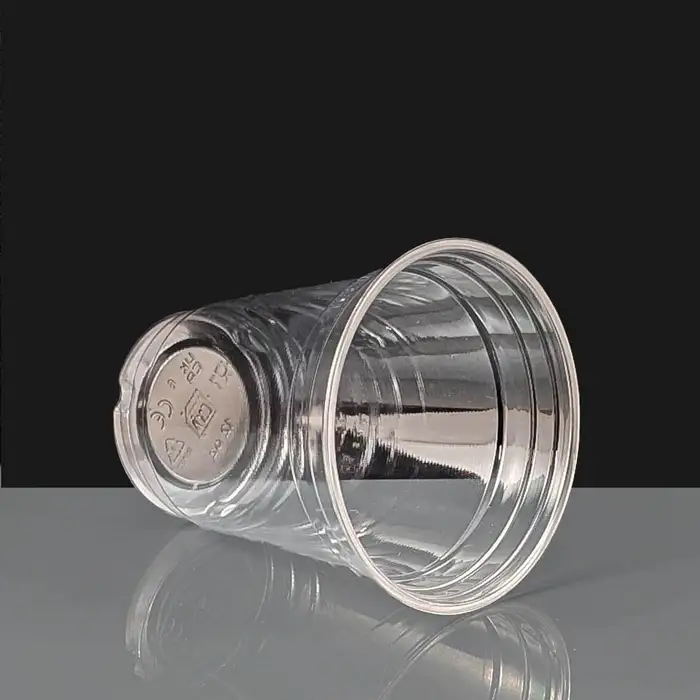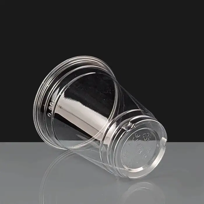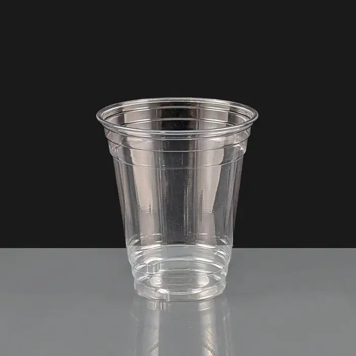 Clear plastic rPET smoothie cup with a capacity of 420ml to brim. The cup is UK CA stamped with a line at 300ml., Made from recycled PET, these glasses are easy to dispose of in kerbside bins after use. Flat and domed lids are available for these cups separately. Ideal for fruit or milk based smoothies, detox drinks and any cold liquids.