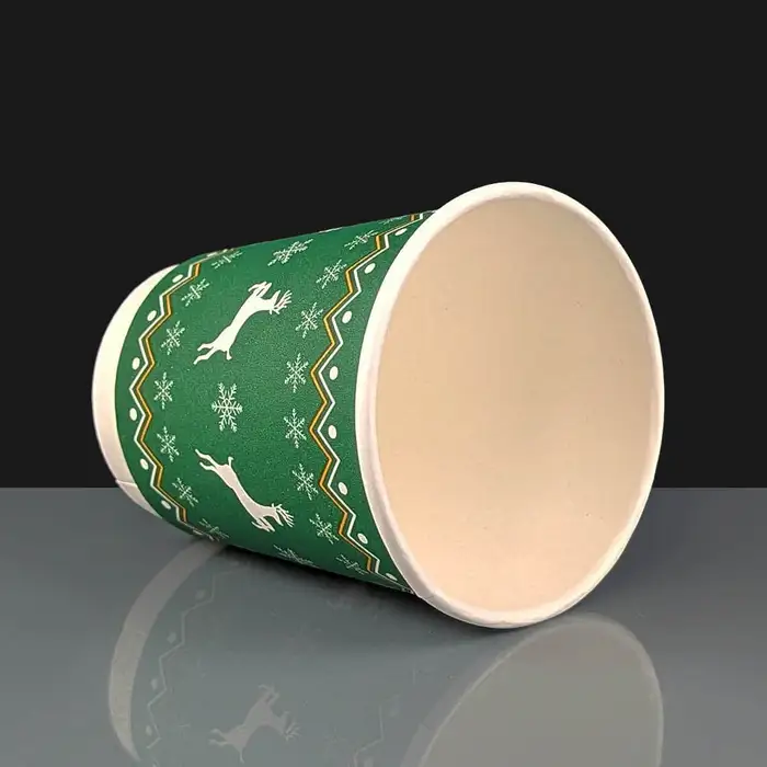 An 8oz Christmas hot drink paper coffee cup with a maximum capacity of 284ml to the rim and branded with a Green & White snowflake and reindeer pattern.