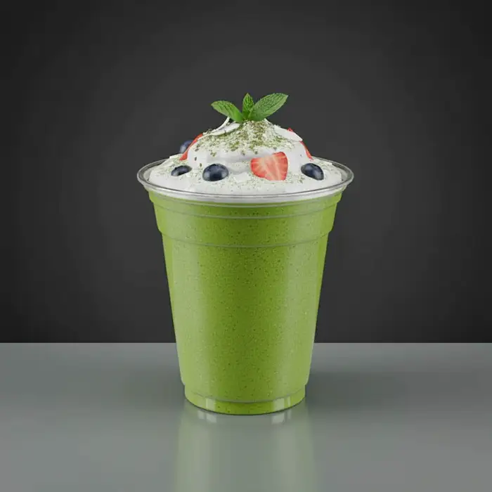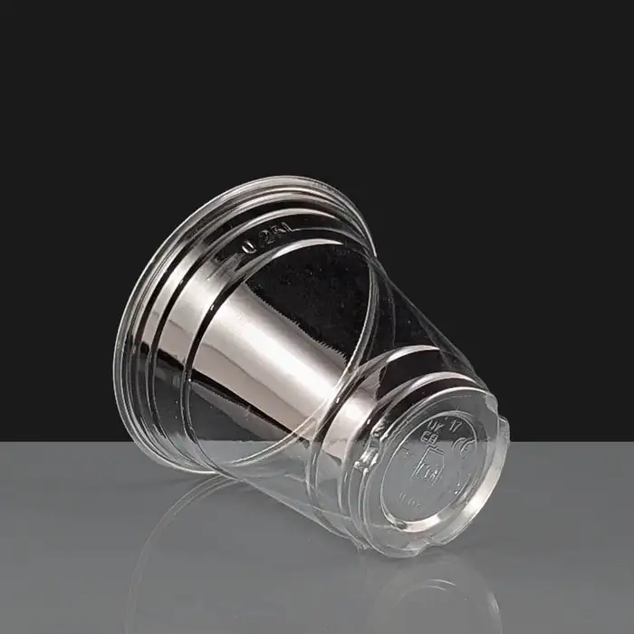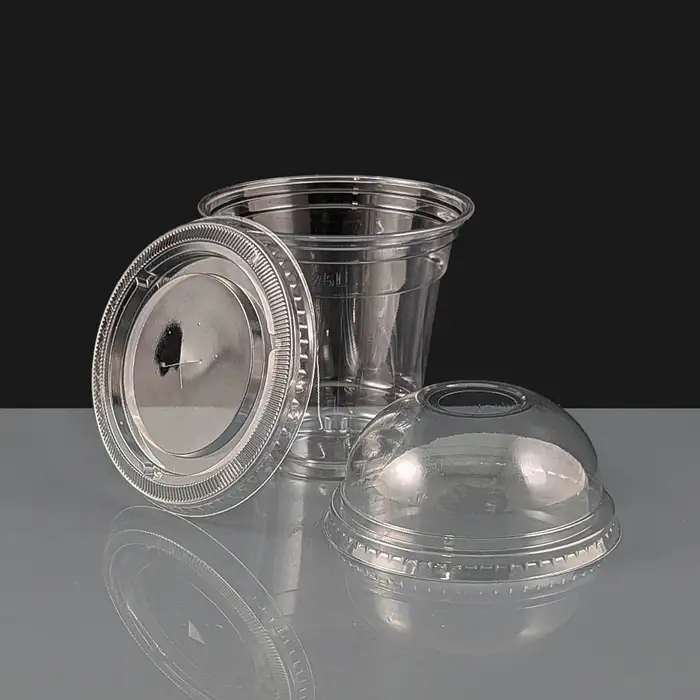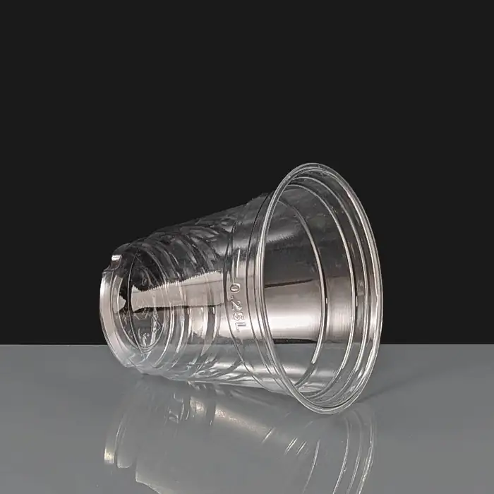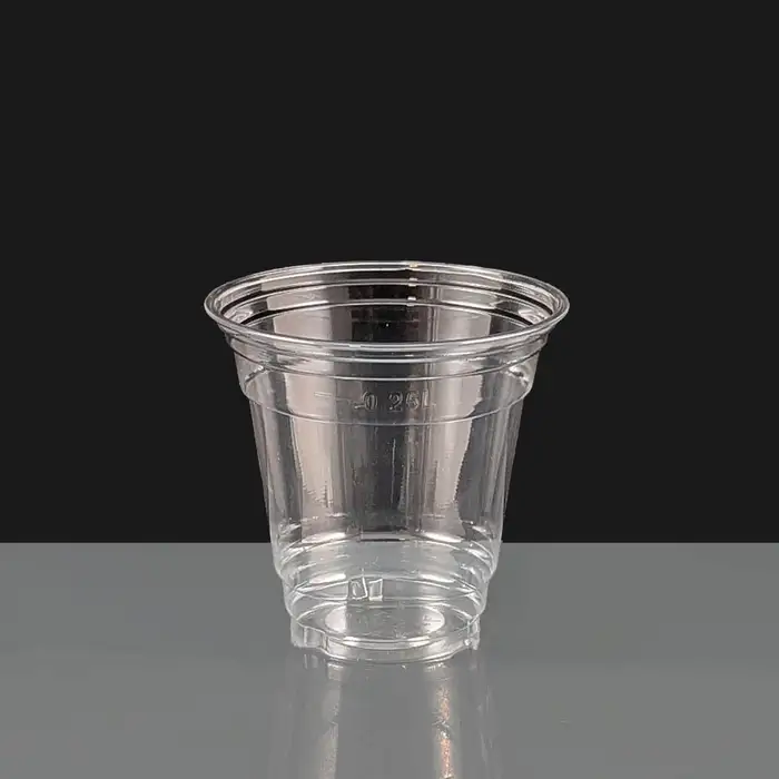 Clear plastic rPET smoothie cup with a capacity of 320ml to brim. The cup is UK CA stamped with a line at 250ml., Made from recycled PET, these glasses are easy to dispose of in kerbside bins after use. Flat and domed lids are available for these cups separately. Ideal for fruit or milk based smoothies, detox drinks and any cold liquids.