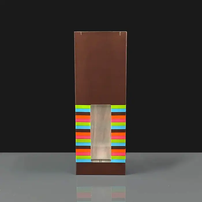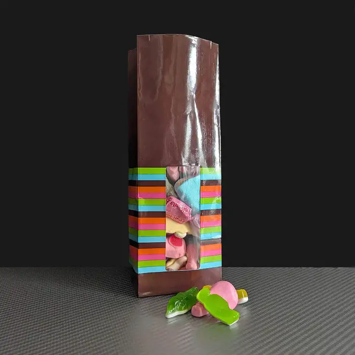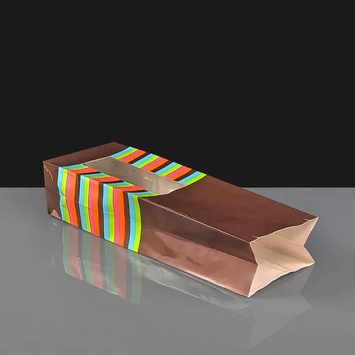 Home > Food Packaging > Paper Bags > Printed Block Bottom Bags > 50 x 83 x 240mm Glossy Brown Windowed Paper Bag with Stripes