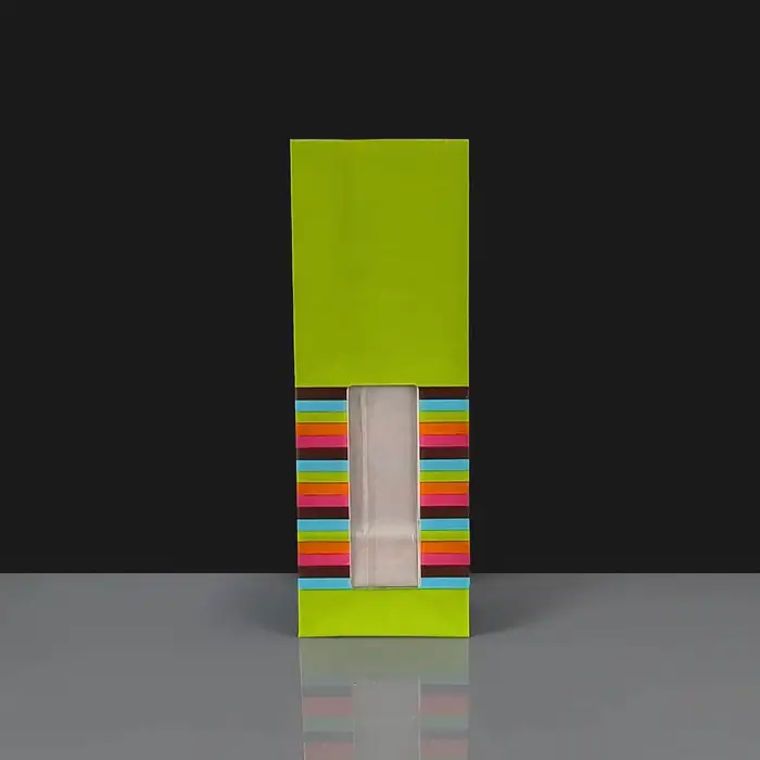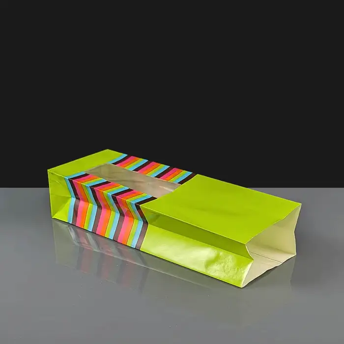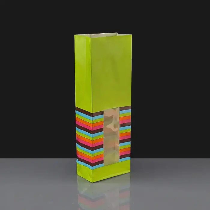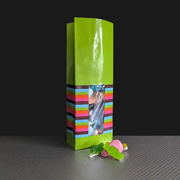 Home > Food Packaging > Paper Bags > Printed Block Bottom Bags > 50 x 83 x 240mm Glossy Green Windowed Paper Bag with Stripes | Sale