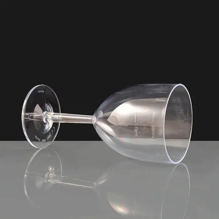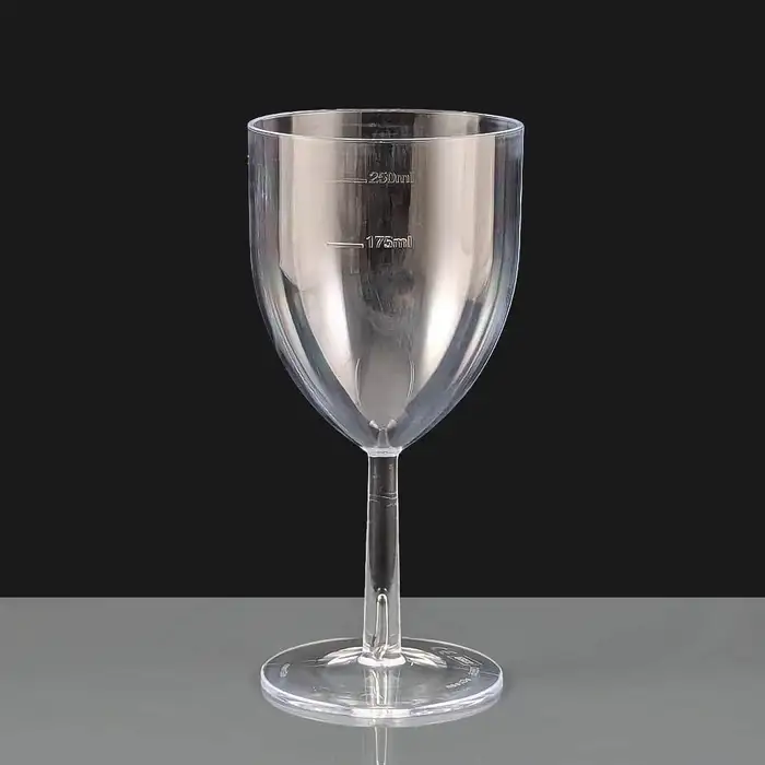 A reusable polystyrene one piece plastic wine glass with CE certified 175ml and 250ml line printed legal measure. The hard walled polystyrene is suitable to be reused and can be dishwashed up to 100 times before becoming brittle and cloudy in appearance. The CE stamped markings are clearly printed / marked on one side of the plastic glasses, it can only be used in a licensed premises where exact measures are not required such as parties, functions and busy gatherings. As it is made of clear reusable plastic, these wine glasses are ideal where real glass is not suitable for safety reasons eg outside, near swimming pools or lively envionrments.