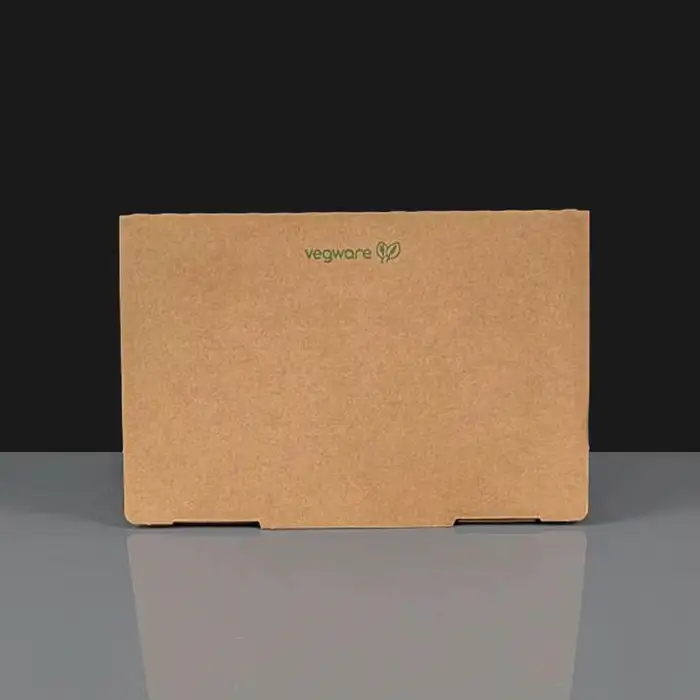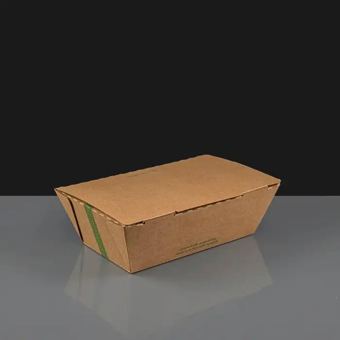Premium hinged hot box by Vegware©, made of microflute corrugated board with a compostable inner coating. These practical boxes work best for food on the go, curries for one, salads, fried chicken and chilli. The hinged lid closes securely and is easily removed to make dining easier. Although they have an inner coating, we don't recommend using them for soups / very wet sauces